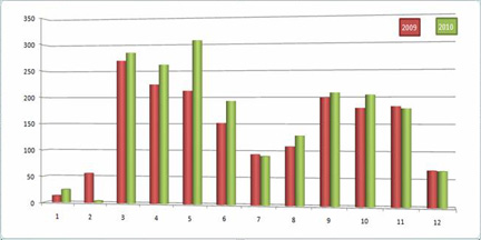 1. 春節(jié)的影響最大,兩年的情況都是:春節(jié)所在的半月,全國幾乎沒有專業(yè)展會。圖上2010年系列在6、7周幾乎沒有會,而2009年系列在4、5周幾乎沒有會,這段時間對應(yīng)相應(yīng)的春節(jié)。并且2010年由于春節(jié)的推后,導(dǎo)致其展會的恢復(fù)在第10周才開始,而09年是第8周就開始了。(當(dāng)然還有天氣回暖的原因)。