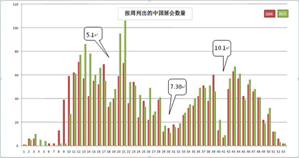好展會從自身數(shù)據(jù)庫中檢索了2009年、2010年的展會情況,把開展日期按周分組,得到了本圖。