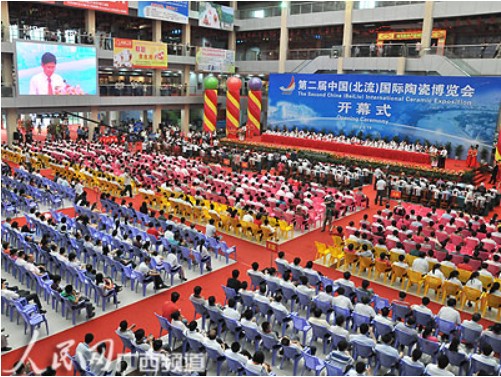 開幕式上,中國輕工工藝品進出口商會副會長張杰與中共北流市委副書記、北流市市長何東真交換協議書文本,共建中國日用陶瓷出口基地。商務部政策研究室副主任張國慶、中國輕工工藝進出口商會副會長張杰、北流市委書記李玉振、北流市市長何東真共同為共建中國日用陶瓷出口基地揭牌。