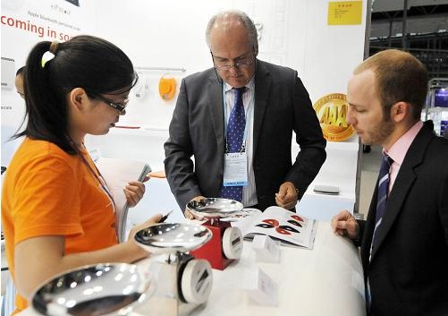 在廣交會一期上,兩位采購商在一個電子秤展位前瀏覽產(chǎn)品介紹。為期5天的廣交會第一期于4月19日結(jié)束。受歐債危機(jī)隱憂持續(xù)、歐元區(qū)經(jīng)濟(jì)衰退風(fēng)險加劇以及新興經(jīng)濟(jì)體面臨通貨膨脹和經(jīng)濟(jì)增速回落疊加影響,本屆廣交會一期成交較上年同期和上一屆,均有一定幅度的下滑。據(jù)統(tǒng)計,機(jī)電產(chǎn)品累計成交額188億美元,占全部成交額的83.9%,較上年春季廣交會同期下降5.5%,較第110屆秋交會下降9.5%。