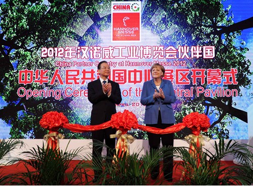 2012漢諾威工業(yè)博覽會(huì) 溫家寶與默克爾出席中國中心展區(qū)開幕剪彩儀式
