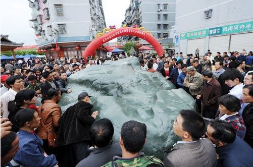 石博會在當?shù)匚幕中V場舉行了最美貴州青觀賞石拍賣會,現(xiàn)場競拍“鴻運當頭”、“洞天福地”、“雙喜臨門”、“回娘家”、“泰坦尼克號”等11尊貴州青,金額達1358.2萬元。一方40多噸重的“江山多嬌”貴州青,200萬元起拍,最終由奇石愛好者袁女士以1000萬元高價拍得。