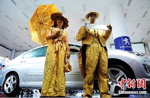 5月3日,以“樂享生活”為主題的2012湖南車展在湖南國(guó)際會(huì)展中心開幕。參展商們?yōu)槲M(fèi)者,各想奇招。在某品牌汽車展區(qū)前,兩位裝扮成活體雕塑的人手拿車牌進(jìn)行促銷,吸引了眾多消費(fèi)者的眼球。(來(lái)源:中新網(wǎng))