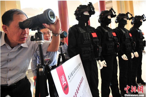 5月9日,“第八屆中國國際國防電子展覽會”在北京展覽館開幕,來自美國、瑞士、德國等12個國家和地區(qū)的三百多家海外知名品牌企業(yè)參展,數(shù)十家世界駐華使館的武官前來觀展。圖為軍警專用的國產(chǎn)數(shù)字化單兵作戰(zhàn)系統(tǒng)及夜間攝像儀吸引觀眾。(來源:中新網(wǎng))