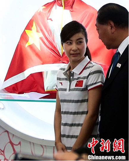 5月17日,2012中國國際體育用品博覽會在北京新國展中心開幕,活動引來不少體育明星到場,郭晶晶匆匆亮相拒談婚期。 圖為郭晶晶(左)、許海峰到場。(來源:中新社)