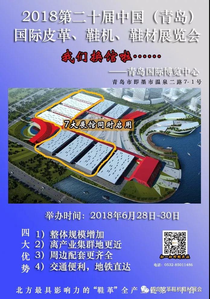 2018第二十屆中國(青島)國際皮革、鞋機(jī)、鞋材展覽會(huì)——2018年6月28日-30日在青島國際博覽中心舉辦。屆時(shí)將秉承佳績,打造「北方專業(yè)的“鞋\箱包\皮具”生產(chǎn)全產(chǎn)業(yè)鏈展覽會(huì) 」,以“新設(shè)備、新材料、新技術(shù)”為主題,開啟制鞋產(chǎn)業(yè)新時(shí)代。同期舉辦的有「2018山東紡博會(huì)」。展出規(guī)模比去年有了大幅度提高,總面積達(dá)80,000平方米,參展商2500家。吸引了來自美國、日本、韓國、德國和意大利等多個(gè)海內(nèi)外著名品牌前來參展,海內(nèi)外80000余采購商買家團(tuán)到會(huì)參觀,展會(huì)期間舉辦各種論壇活動(dòng)80余場(chǎng)次,近200家新聞媒體進(jìn)行新聞報(bào)道。