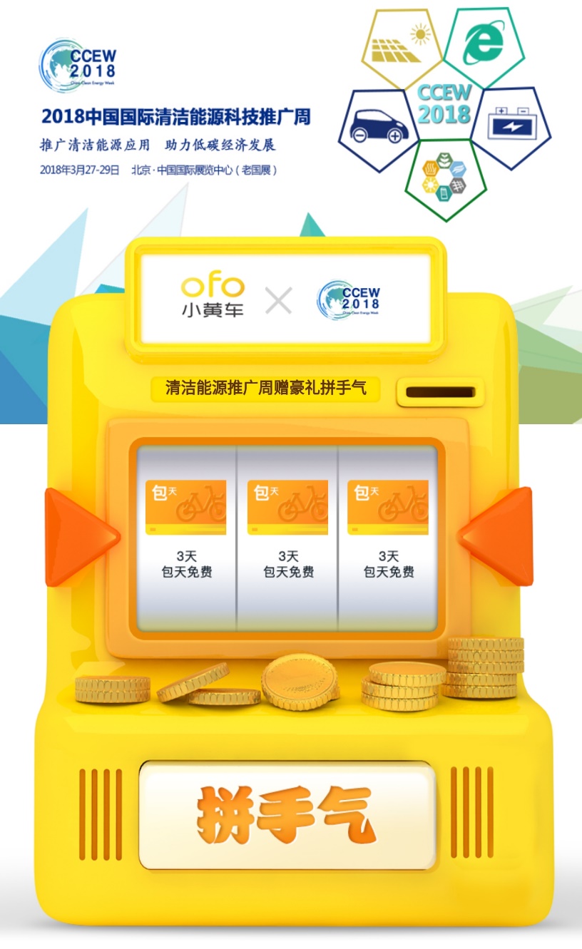 2017年,共享單車行業(yè)經(jīng)歷一輪大規(guī)模洗牌,從百家爭(zhēng)鳴到兩強(qiáng)爭(zhēng)霸,似乎只在一夕之間。暗潮洶涌的共享單車還將迎來(lái)哪些變革,圈內(nèi)眾說紛紜,當(dāng)然,用戶資源的搶奪肯定是未來(lái)博弈的關(guān)鍵。而一向在營(yíng)銷上頗受消費(fèi)者好評(píng)的“國(guó)民單車”ofo小黃車這一次又拔得開年頭彩,1月15日,ofo小黃車與2018中國(guó)國(guó)際清潔能源科技推廣周(以下簡(jiǎn)稱“推廣周”,英文:China Clean Energy Week 2018,簡(jiǎn)稱:CCEW2018)聯(lián)合推出的ofo小黃車優(yōu)惠禮包——手氣卡在推廣周官方微博及微信平臺(tái)正式上線,掀起2018新一輪跨界營(yíng)銷的風(fēng)潮。