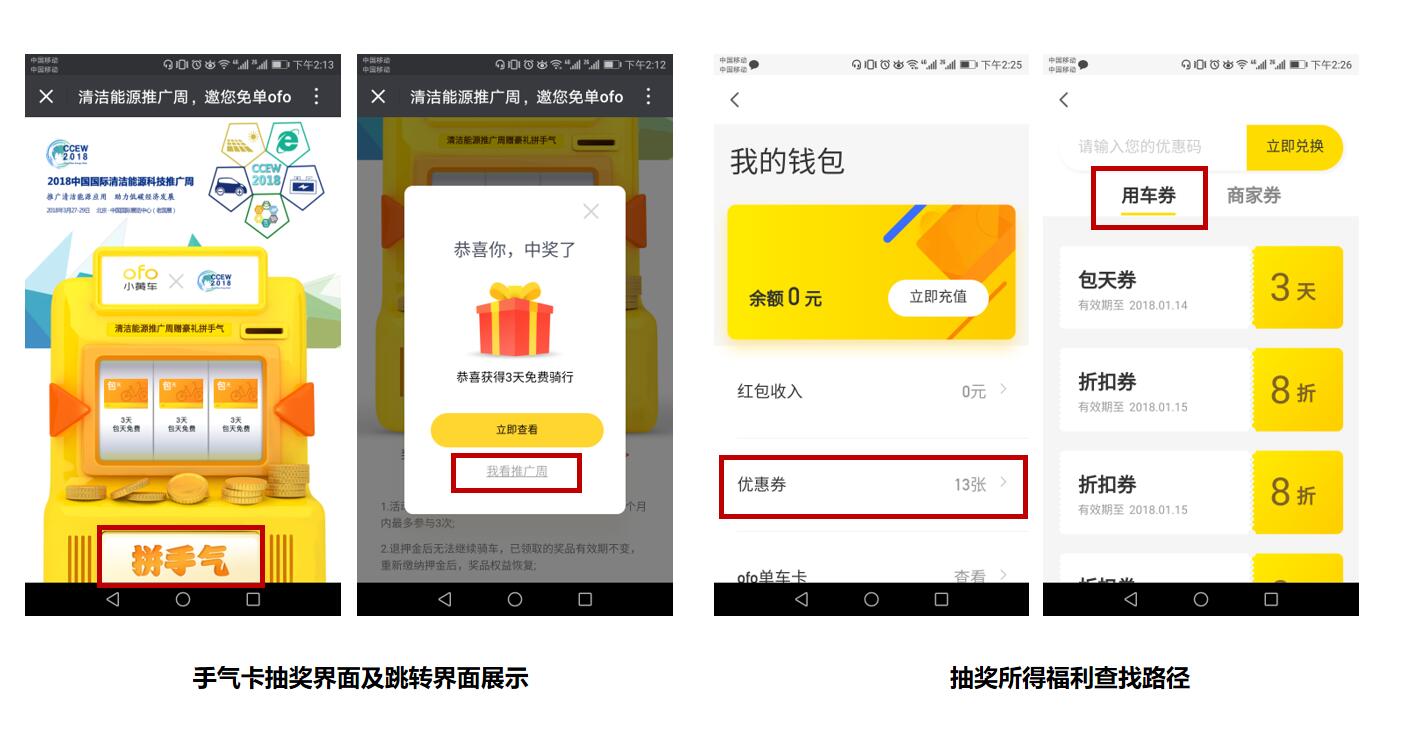 熟悉小黃車的用戶都知道,月卡和騎行券一直是ofo的固定福利模式,而全新上線的手氣卡,則將ofo的福利資源進(jìn)行了全面整合。手氣卡是一個(gè)包含月卡、周卡、騎行券、折扣券等多重優(yōu)惠福利的大禮包,用戶通過老虎機(jī)搖獎(jiǎng)即可隨機(jī)獲得不同種類的優(yōu)惠獎(jiǎng)品。參與2018中國(guó)國(guó)際清潔能源科技推廣周與ofo小黃車聯(lián)名手氣卡的方式非常簡(jiǎn)單,活動(dòng)期內(nèi),用戶可通過推廣周官方微博、微信、EDM等平臺(tái)找到活動(dòng)消息: