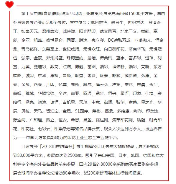 第十屆中國(青島)國際紡織品印花工業(yè)展覽會,展覽總面積逾15000平方米,國內(nèi)外百家參展企業(yè)近500個展位。其中包含:杭州宏華、愛普生、世紀(jì)方達(dá)、臺灣奇正、如皋天元、溫州碧宏、誠赫瓏、陽光酷印、瑞文風(fēng)青、北京三義、益彩、贏彩、企亞、旭峰、盛世昆侖、同晉、騰達(dá)、惠立彩、DC德弘萬成、咔咻激光、恒金鼎、青島銘洋、東莞至上、世紀(jì)威揚、無錫眾旺、向日葵印花、濟(jì)南華飛、無錫冠伍、弘泰、金豪、鄭州鴻盛、珠海墨的、晨曦、傳美訊、藍(lán)宇、富多彩、迅鐳、利宣、力美、鑫速彩、鼎亮、點滴、博越、富圖、端彩、福諾新、端彩、亮新、東方軟圖、誠印、東華、康橋、昌順、聯(lián)盟、粵彩、聯(lián)泰,邦葳、葳新葳、弘康、金泰、金蔥、酋泰、凡印、億鑫、赤新、聯(lián)成、海云花、決策、震達(dá)、東晨、長江、赫姆、雅域、華騰怡德、全達(dá)、南亞、四通、鼎金、恒興、星河、印象、佳境、彩噴行、鼎亮、涵濤、瑞恒、吉凱恩、天茂、中意、御瀾、弘創(chuàng)、富蕾、星之光、華辰、貝拉、天馬、智匯寶、金晟、91圖庫、榮彬、福鼎、多維康、絢彩、印美達(dá)、源空間、廣印通、西立、恒安、希恩、昌盈、瓦欄網(wǎng)、集萃印花網(wǎng)、浩瀚、時尚印花、印花社、七彩云、印染雜志等知名品牌云集,觀眾人次達(dá)到萬余人。被業(yè)界譽為——中國北方最具影響力的印花工業(yè)生態(tài)全產(chǎn)業(yè)鏈平臺。