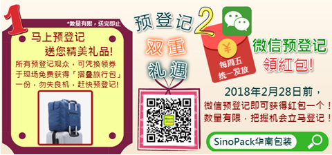 參展商名單現(xiàn)已上載至展會官方網(wǎng)站,觀眾可預(yù)先上網(wǎng)查看參展商名單并于網(wǎng)上進(jìn)行預(yù)先登記。預(yù)先登記觀眾更可享有免費換領(lǐng)大會會刊和折迭旅行袋禮品、優(yōu)先參加現(xiàn)場專題研討會及免除現(xiàn)場登記手續(xù)等優(yōu)惠。立即到展會網(wǎng)頁www.ChinaSinoPack.com 或 www.PACKINNO.com進(jìn)行預(yù)先登記,觀眾預(yù)登記截止日期為2018年3月4日。