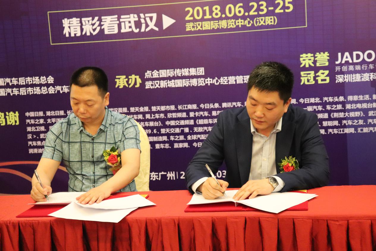 隨后的戰(zhàn)略簽約和戰(zhàn)略授牌儀式中,首先是點(diǎn)金傳媒譚校長與JADO捷渡智能(中國)王杰董事長兩位代表正式簽約,宣布雙方達(dá)成2018武漢展及后續(xù)的戰(zhàn)略合作。
