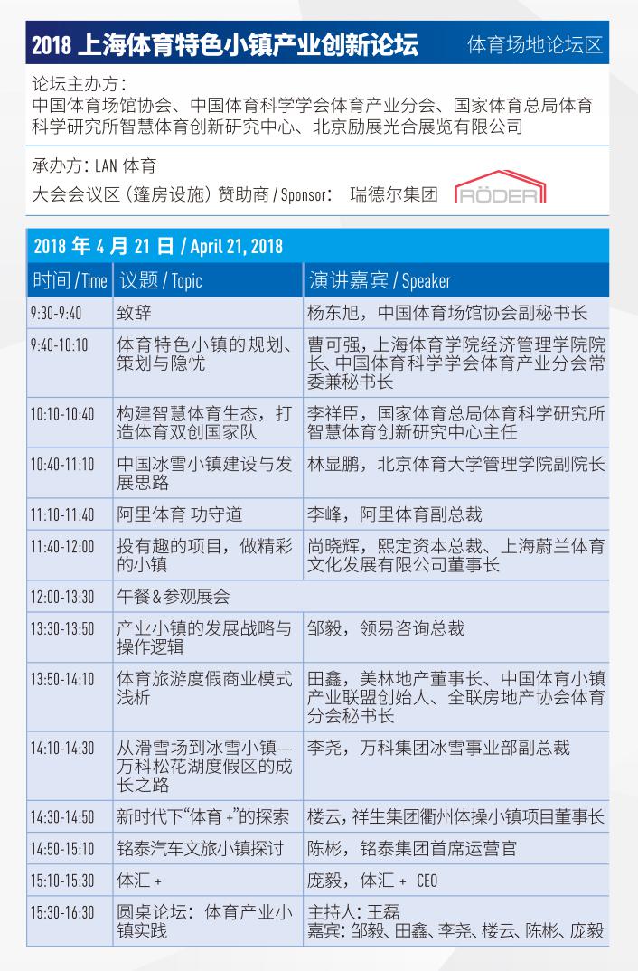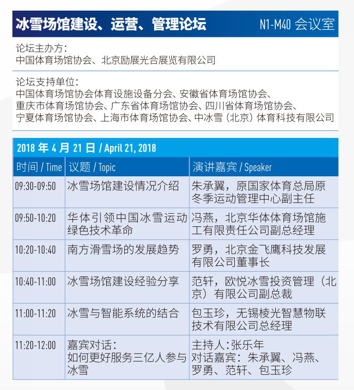 明天21日主題特色論壇“冰雪場(chǎng)館建設(shè)、運(yùn)營(yíng)、管理論壇”和“2018上海體育特色小鎮(zhèn)產(chǎn)業(yè)創(chuàng)新論壇”,也將分別于N1-M40會(huì)議室和館內(nèi)體育場(chǎng)地論壇區(qū)舉辦。