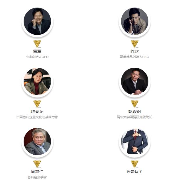 還是打算邀請雷軍(小米創(chuàng)始人董事長兼CEO)?陳歐(聚美優(yōu)品CEO創(chuàng)始人)?陳春華(中國著名企業(yè)文化與戰(zhàn)略專家)?胡鞍鋼(清華大學(xué)國情研究院院長)?周其仁(著名經(jīng)濟(jì)學(xué)家)等等;