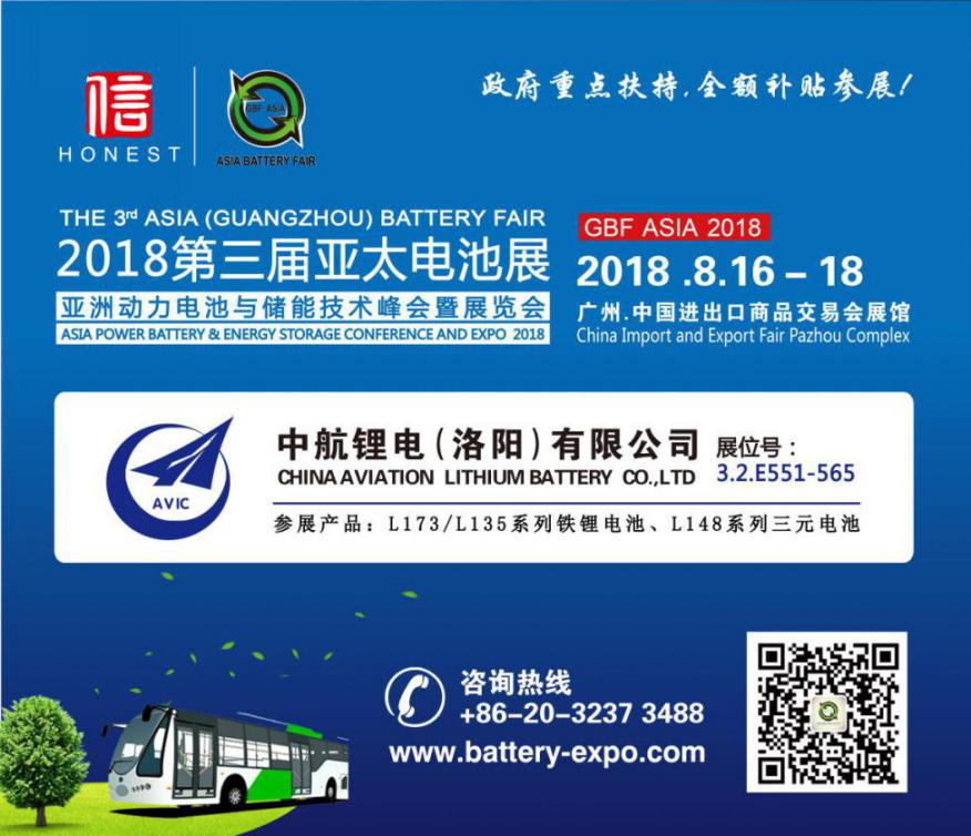 第三屆亞太電池展、亞洲動力電池與儲能技術(shù)峰會(GBF ASIA 2018)于8月16日-18日在廣州琶洲·廣交會展館A區(qū)舉辦,中航鋰電(洛陽)有限公司(下稱“中航鋰電”)攜公司產(chǎn)品以支持單位身份隆重亮相。