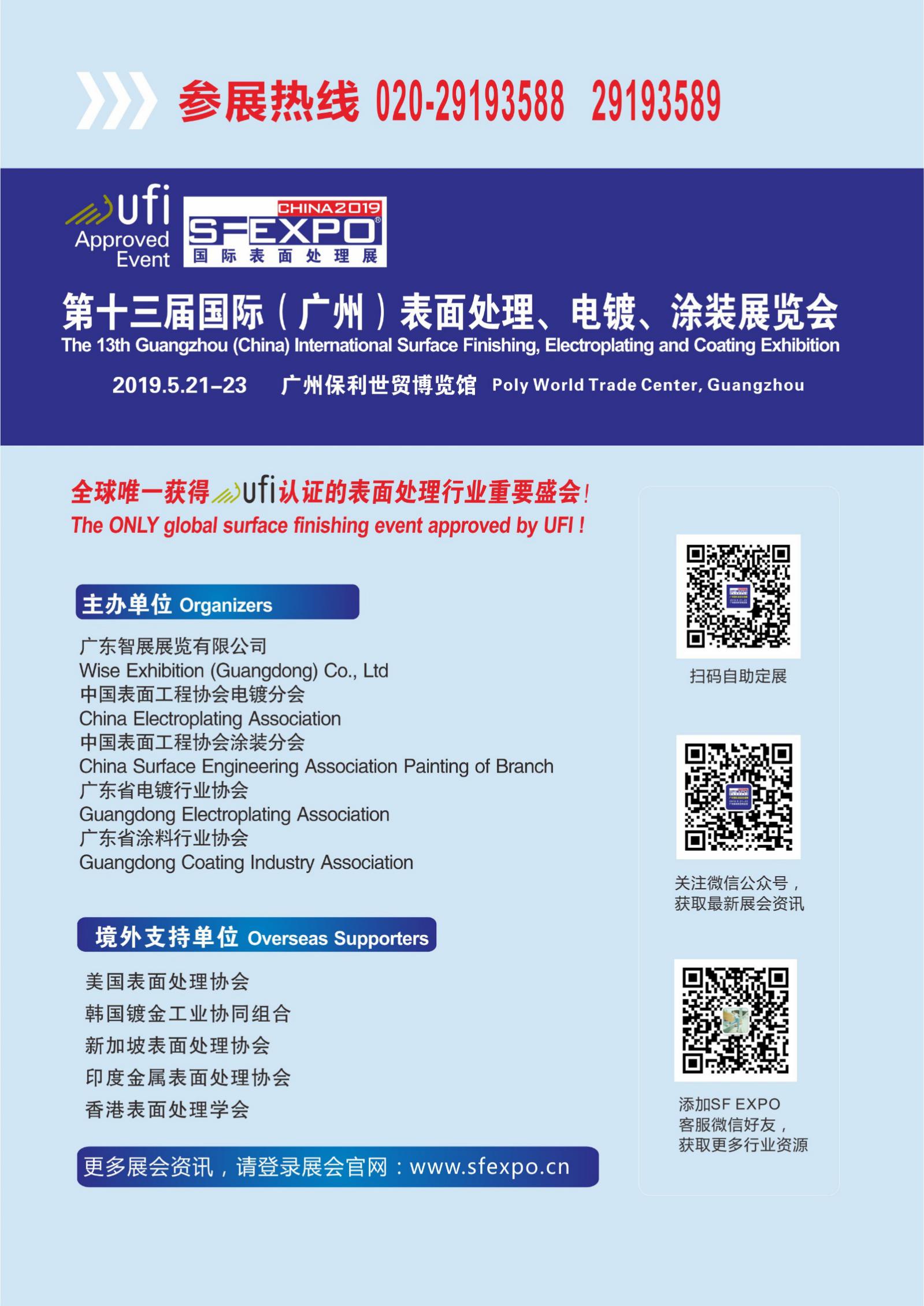 下屆展會(huì)將定于廣州,于2019年5月21-23日在廣州保利世貿(mào)博覽館隆重舉行!SF EXPO2019將加入智能制造、環(huán)保及安全等板塊,并在同期舉辦工業(yè)涂料展覽會(huì)及多個(gè)高峰論壇及技術(shù)研討會(huì)等。目前,2018國際(廣州)表面處理電鍍涂裝展覽會(huì)已進(jìn)入火熱的籌備階段!