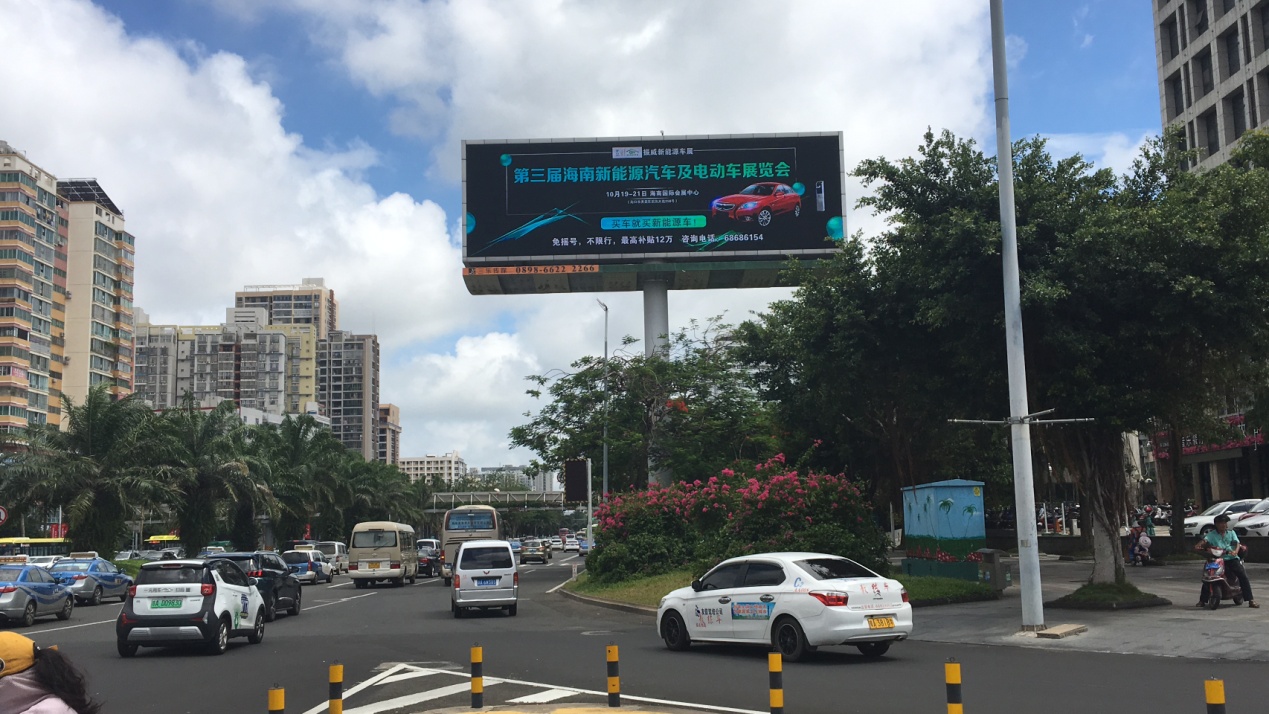 ??谑旋埨ツ下放_灣大廈前的第三屆海南新能源車展LED廣告