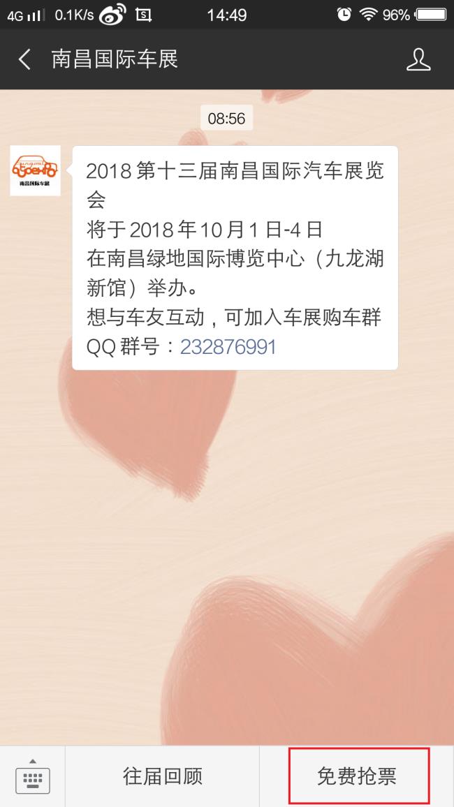 即日起到9月31日下午17點(diǎn)前你只要通過(guò)“南昌國(guó)際車展”官方微信公眾號(hào)就可以領(lǐng)取車展免費(fèi)門票。