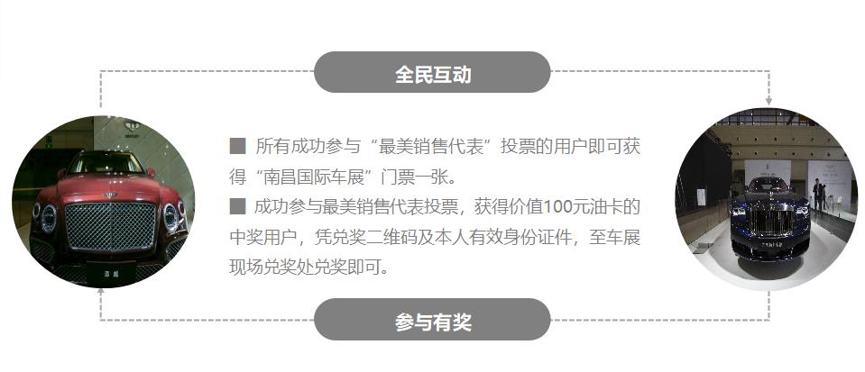 1、通過登錄南昌國際車展官網(wǎng)或關(guān)注“南昌國際車展”官方微信,打開江西最美銷售代表評選頁面,為喜愛的銷售代表投票,每人每天有5次投票權(quán),最終以線上得票多少評出“最美銷售代表”。
