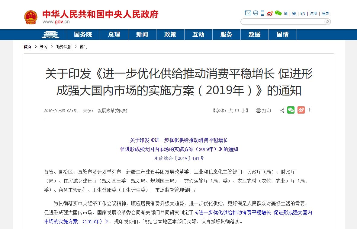 1月29日,國家發(fā)改委會同工業(yè)和信息化部、商務(wù)部等十部委聯(lián)合印發(fā)了《進(jìn)一步優(yōu)化供給推動消費(fèi)平穩(wěn)增長促進(jìn)形成強(qiáng)大國內(nèi)市場的實(shí)施方案(2019年)》中,制定六大措施促進(jìn)汽車消費(fèi),涉及老舊汽車報廢更新、新能源補(bǔ)貼、農(nóng)村汽車更新?lián)Q代等方面。