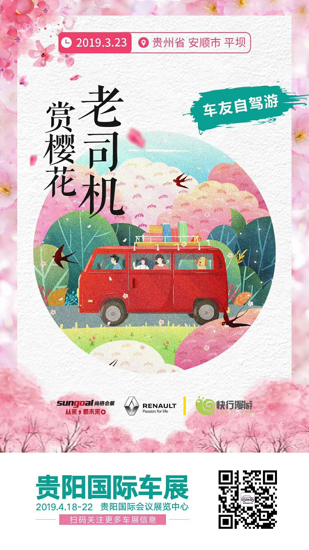 陽春三月,櫻花爛漫。2019年3月23日,2019貴陽國際車展與貴州十和田風景雷諾聯合舉辦的“老司機.賞櫻花”車友自駕游活動圓滿舉行!本期參與活動的雷諾車主正式成為“貴州365自駕車友會”首批會員,感謝所有車主和貴州黃果樹智慧旅游股份有限公司、平壩櫻花萬畝園景區(qū)和貴州風景汽車銷售服務有限公司的大力支持。預祝4月18-22日所有2019貴陽國際車展車商大賣!