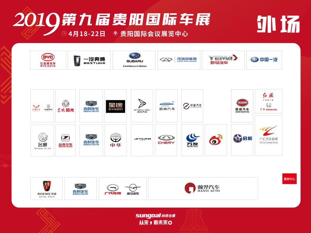 外 場(按順時針方向):比亞迪汽車、一汽奔騰、斯巴魯、奇瑞新能源、野馬汽車、中國一汽、紅旗、斯威汽車、中星汽車、歐尚汽車、新特汽車、星途、吉利汽車、東風(fēng)風(fēng)光、寶沃汽車、五菱汽車、MG、眾泰汽車、中華、捷途、奇瑞汽車、萬友、新浪、東風(fēng)啟辰、廣匯汽車服務(wù)、瀚羿汽車、海馬汽車、廣汽傳祺、吉利汽車、榮威汽車