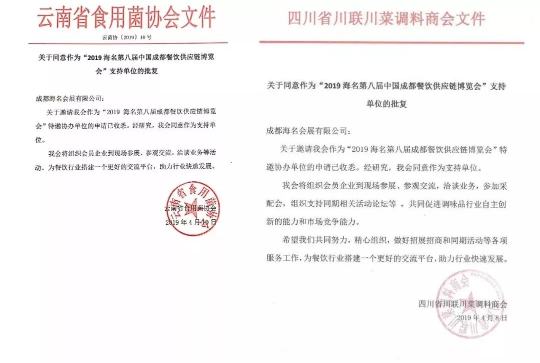 【朱臺鎮(zhèn)行業(yè)商會、全國工商聯(lián)廚具商會西部工作站、成都市水產(chǎn)行業(yè)協(xié)會、云南省食用菌協(xié)會、四川省川聯(lián)川菜調料商會 復函】