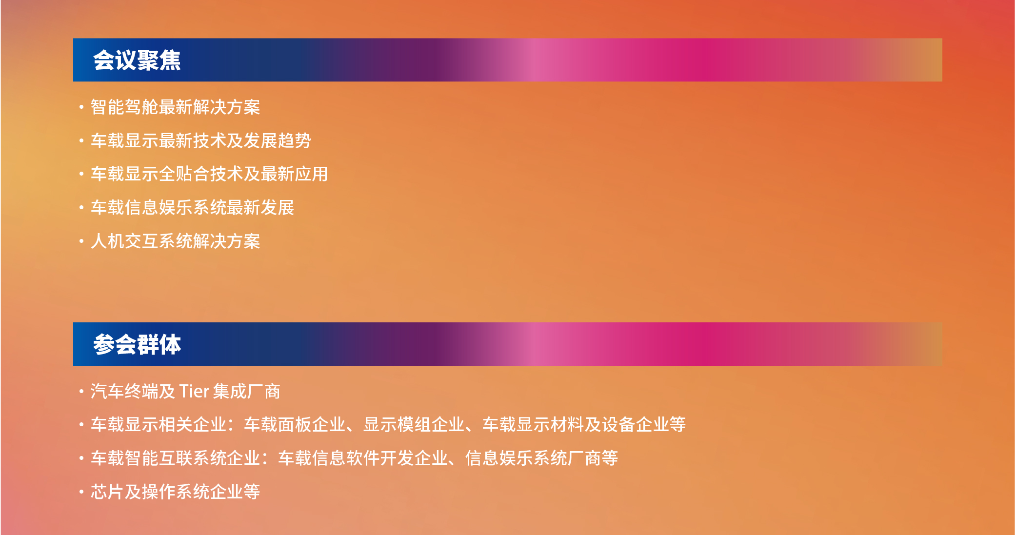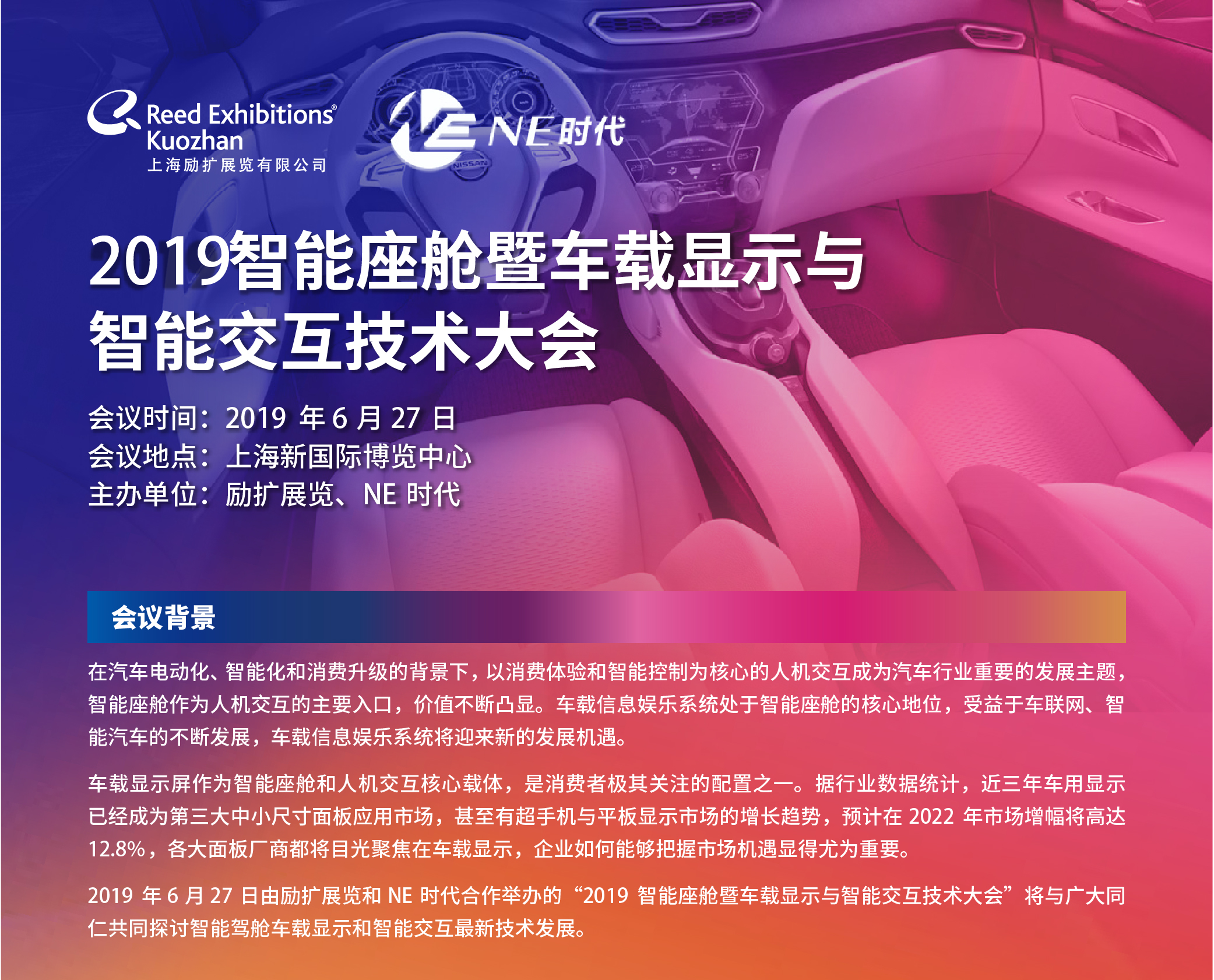 導(dǎo)語:2019年6月27日,勵擴展覽和NE時代將合作舉辦“2019智能座艙暨車載顯示與智能交互技術(shù)大會”系列活動將在2019國際新型顯示技術(shù)展現(xiàn)場隆重舉辦。本次系列活動立足于智能座艙高速發(fā)展的風(fēng)口,圍繞智能表面技術(shù)、車載顯示、智能交互等熱點話題,與廣大同仁共同探討業(yè)內(nèi)最新技術(shù)發(fā)展趨勢,探索行業(yè)發(fā)展未來。