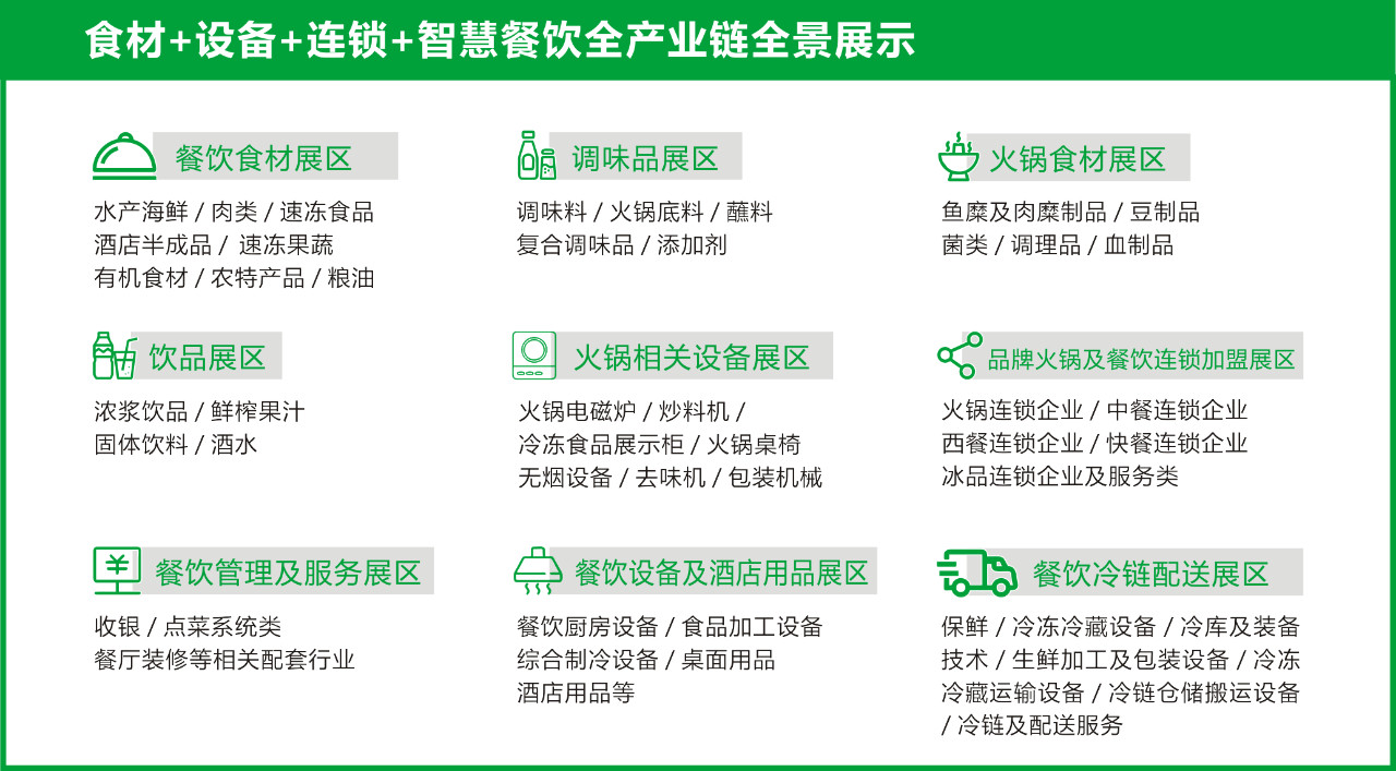 本屆展會規(guī)模升級,60000㎡展示面積,設(shè)置5大展館,9大展區(qū),2000多家參展企業(yè),展示餐飲食材、調(diào)味品、火鍋食材及用品、餐飲設(shè)備及酒店用品、咖啡飲品、連鎖加盟、冷鏈物流等相關(guān)的萬款產(chǎn)品。同時特設(shè)餐飲冷鏈配送展區(qū)、餐飲食材加工與包裝展區(qū)。展區(qū)主題不斷豐富,展品覆蓋餐飲全產(chǎn)業(yè)鏈。