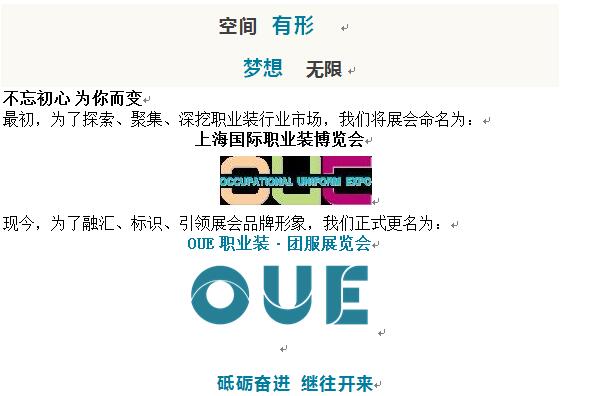 您好,當(dāng)您打開這封信時,我們的緣分就此種下。十分感謝您關(guān)注OUE職業(yè)裝·團服展覽會(原稱:上海國際職業(yè)裝博覽會),細(xì)心的您一定發(fā)現(xiàn)我們展會對外展示形象有所變化了。為了解答您的所有疑惑,我們誠摯地寫下這份書信,向您介紹OUE職業(yè)裝·團服展的“前世今生”。