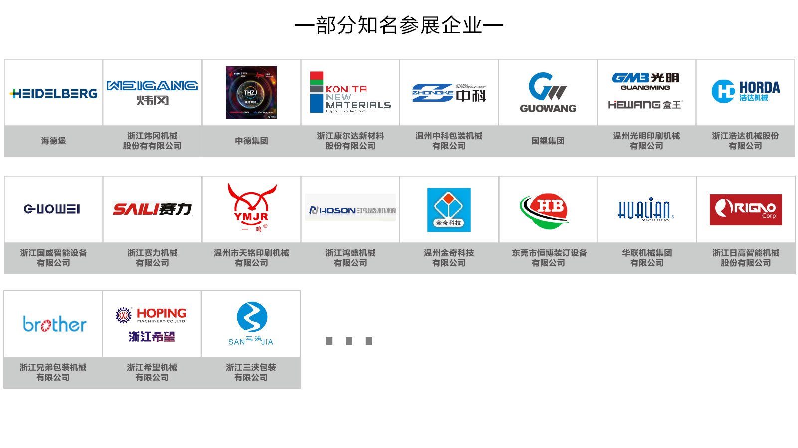 展會依托溫州——“中國印刷城”、“中國包裝機械城”、“中國印刷材料交易中心”、“中國印刷設備制造業(yè)第一區(qū)域品牌”、全球優(yōu)質制造商聚集地產業(yè)高地優(yōu)勢和強勁的市場需求,吸引國內外知名企業(yè)、品牌參展,展會展出產品涵蓋印刷、包裝、廣告標識、數碼印花、圖文快印等品類。海德堡、煒岡、中德、康爾達、中科、國望、光明、浩達、國威、賽力、天銘等印刷行業(yè)龍頭企業(yè)悉數參與展會;“智能包裝產業(yè)技術聯盟”成員華聯、日高、希望以及兄弟、三浹等包裝設備知名企業(yè)將攜新品展出;此外,博印、金奇、明睿等數碼印花、圖文快印、廣告標識企業(yè)也將共襄盛會。