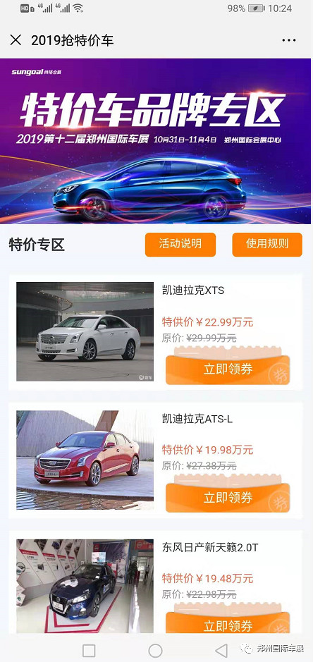 ◆關(guān)注【鄭州國(guó)際車展】官方微信,選擇【車展活動(dòng)】菜單,點(diǎn)擊【5折搶特價(jià)車】,即可參與搶特價(jià)車活動(dòng),選擇意向特價(jià)車型,獲得專屬搶特價(jià)車資格券,保存券號(hào),車展期間隨機(jī)抽取,成為準(zhǔn)車主。