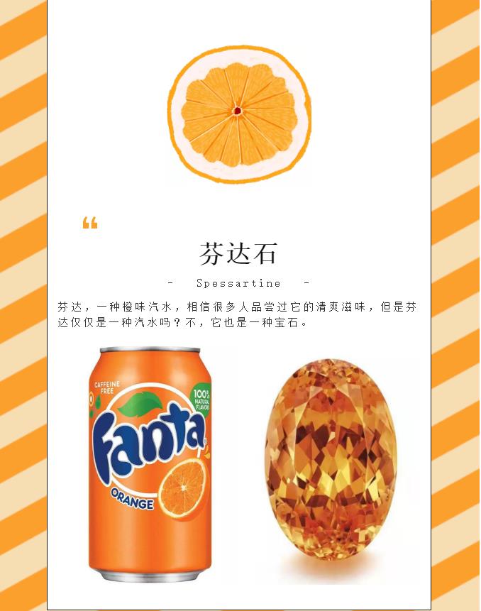 后來經研究鑒定,發(fā)現(xiàn)這其實是一種含錳鋁元素的石榴石,任何用化學、地理或顏色來命名的方法,顯然不足以形容它明艷燦爛的顏色。最后,一種代表快樂趣味的橙味汽水名字被它成功借用——Fanta,芬達之于芬達石,堪稱天作之合。