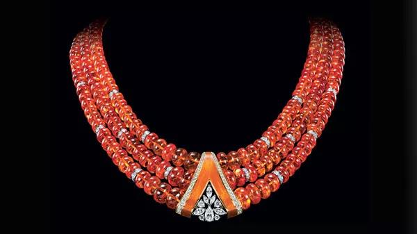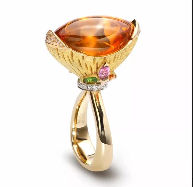 芬達石的致色元素是鐵和錳,決定它能夠呈現(xiàn)出猶如芬達般純凈鮮艷而又明亮的橙色,使得它在歐美市場受到熱烈歡迎。不少知名的珠寶品牌,如今都開始采用優(yōu)質的芬達石作為創(chuàng)作靈感,設計了一系列夢幻的珠寶作品。