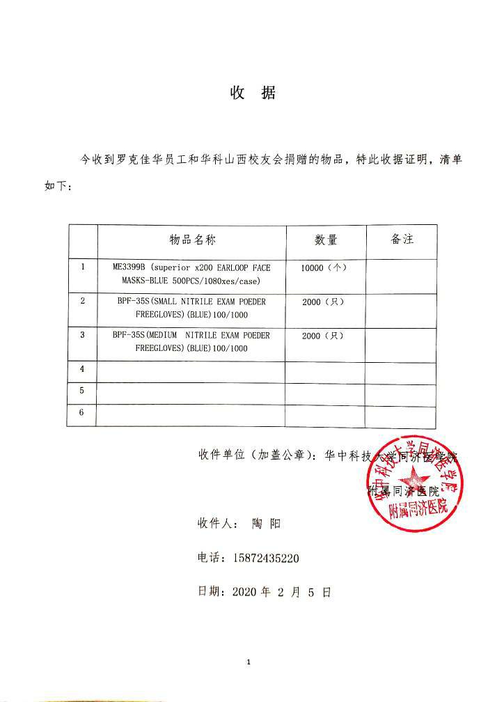 “第二批物資:護目鏡品罩,170箱,1.7萬只;醫(yī)用口罩,80箱,4萬只,醫(yī)用手套120箱,12萬雙,已經發(fā)出,請注意查收。”2月5日,羅克佳華組織捐贈的第一批醫(yī)療醫(yī)用口罩1萬只、醫(yī)用手套4000雙已經由武漢同濟醫(yī)院接收并應用。第二批物資正在運往武漢的路上,為抗戰(zhàn)在一線的醫(yī)護人員送去緊缺的“武器”。