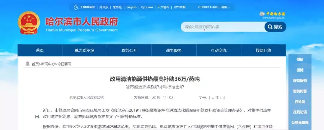 去年哈爾濱市財政局會同哈爾濱市生態(tài)環(huán)境局印發(fā)《哈爾濱市2019年整治燃煤鍋爐推進清潔化能源使用財政補助資金管理辦法》,對集中供熱并網(wǎng)、改用清潔化能源、廢棄拆除燃煤鍋爐制定了相應補助標準。