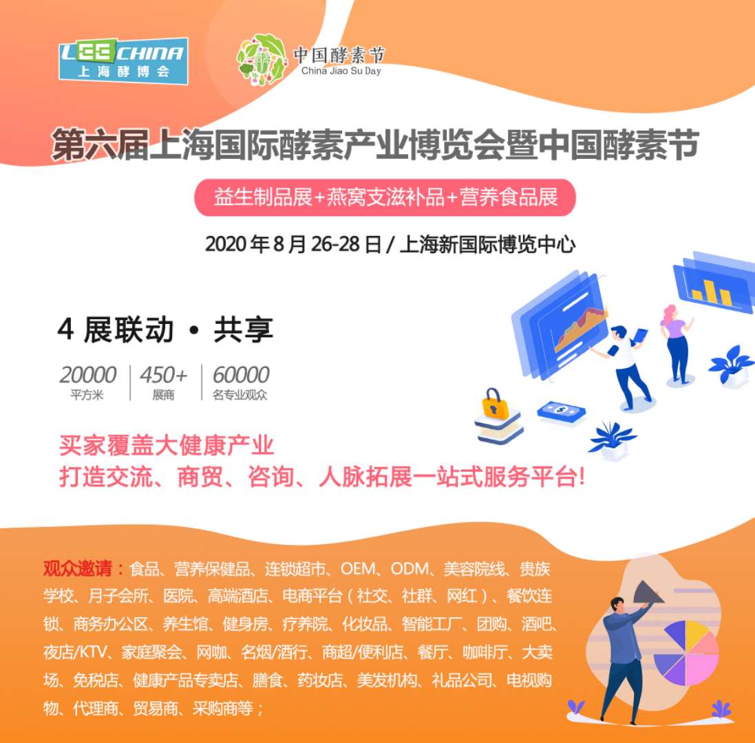 據(jù)悉:上海國際酵素產(chǎn)業(yè)博覽會暨中國酵素節(jié)由中國生物發(fā)酵產(chǎn)業(yè)協(xié)會主辦,上海信世展覽服務有限公司承辦,中國生物發(fā)酵產(chǎn)業(yè)協(xié)會酵素分會、中國生物發(fā)酵產(chǎn)業(yè)協(xié)會益生制品分會、中國健康養(yǎng)生網(wǎng)協(xié)辦。自2015年開展以來,已成功舉辦五屆,連續(xù)5年,無論是訪客量、成交量、參展面積都遠超往屆及同類型的展會,是目前酵素行業(yè)領先的展會。2020年上海酵博會新增五大特色專題展:健康植物飲品專題展、新電商選品專題展、酵素日化專題展、酵素飲品專題展、農(nóng)用酵素及酵素農(nóng)業(yè)專題展。
