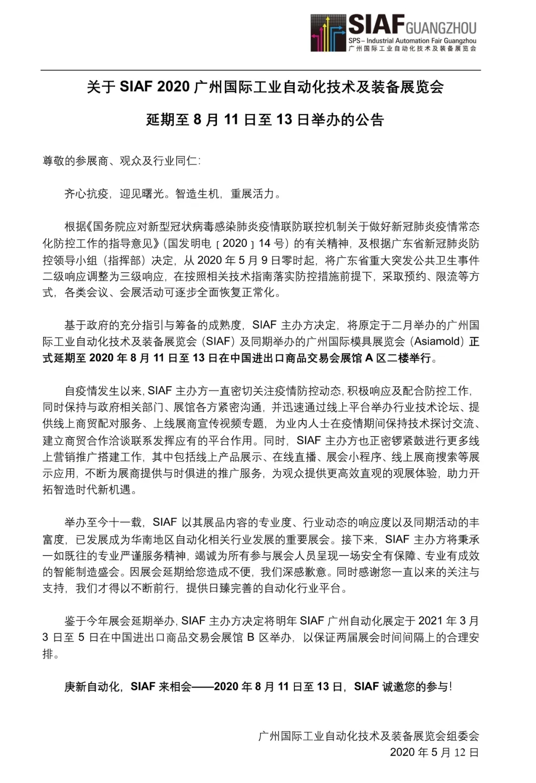 廣州光亞法蘭克福展覽有限公司董事長(zhǎng)杜承華先生代表主辦方表示:“ 在與業(yè)內(nèi)的合作伙伴協(xié)商后,我們很高興為SIAF和Asiamold確立了新的展會(huì)日期。我們相信現(xiàn)在是一個(gè)重要時(shí)機(jī),通過(guò)SIAF和Asiamold,我們將致力為工業(yè)自動(dòng)化技術(shù)及模具領(lǐng)域提供有效的平臺(tái),從而幫助行業(yè)復(fù)蘇。”他續(xù)說(shuō):“我們也會(huì)竭盡所能,為所有業(yè)內(nèi)人士提供一個(gè)安全的展會(huì)環(huán)境。我們稍后將會(huì)公布更多相關(guān)的防疫措施。”