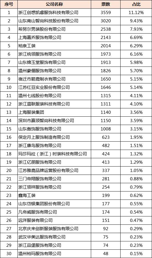 活動自舉辦以來,得到了許多職業(yè)裝企業(yè)的熱烈反響,報(bào)名者絡(luò)繹不絕。5月28日至6月28日,網(wǎng)絡(luò)投票,網(wǎng)絡(luò)投票評分占總分值10%,現(xiàn)公布網(wǎng)絡(luò)投票結(jié)果: