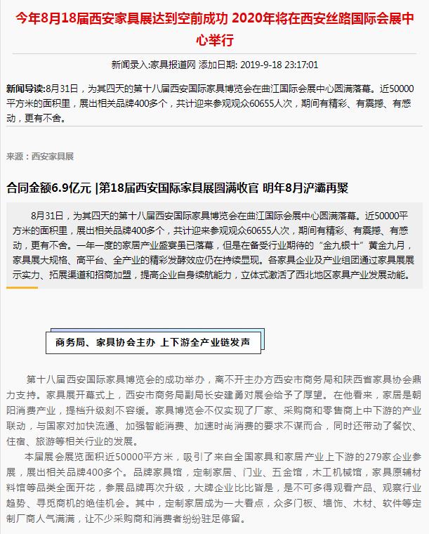 2020年9月17-20日,匯聚眾多期待的第19屆西安國(guó)際家具博覽會(huì)暨西安全屋定制家居展覽會(huì)(以下簡(jiǎn)稱西安家具展)將在西安國(guó)際會(huì)展中心盛大啟幕,呈現(xiàn)一場(chǎng)精彩大氣的家具展,為大型會(huì)展活動(dòng)再添濃墨重彩的一筆。