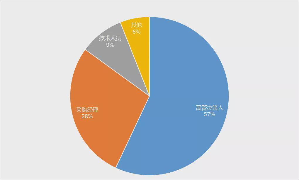 在本屆具有商業(yè)價值的專業(yè)觀眾共計49012人次,其中占比較多的高管決策人,達到57%;其次,采購經(jīng)理占比28%、技術(shù)人員占比9%,其它占比6%。