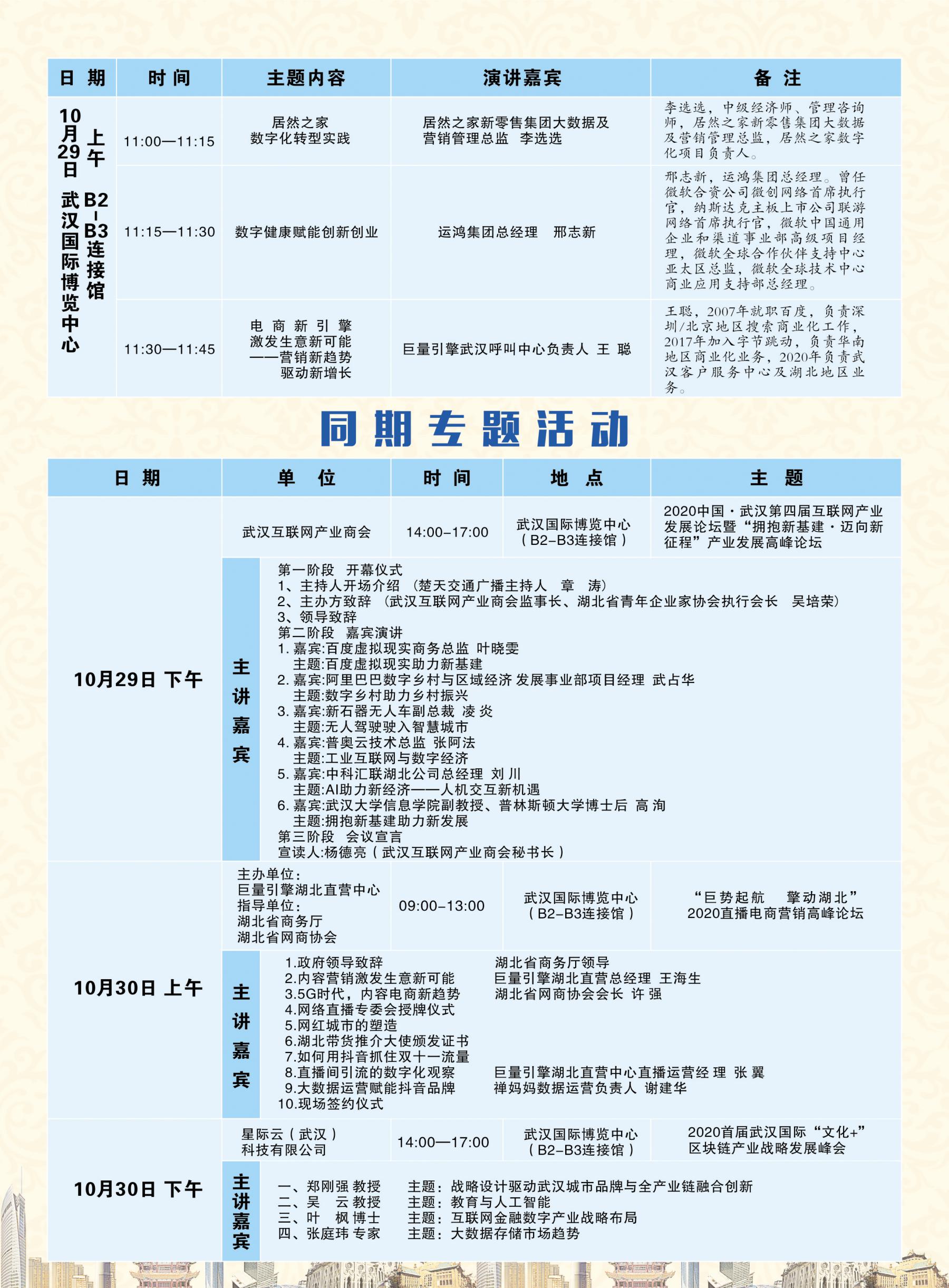 展會(huì)將于10月29日開(kāi)幕,期間將同步舉辦第六屆長(zhǎng)江經(jīng)濟(jì)帶電子商務(wù)高峰論壇、第三屆武漢社交新零售微商大會(huì)、“巨勢(shì)起航 擎動(dòng)湖北”2020直播電商營(yíng)銷高峰論壇、2020首屆武漢國(guó)際“文化+”區(qū)塊鏈產(chǎn)業(yè)戰(zhàn)略發(fā)展峰會(huì)、2020中國(guó)•武漢第四屆互聯(lián)網(wǎng)產(chǎn)業(yè)發(fā)展論壇暨“擁抱新基建 • 邁向新征程”產(chǎn)業(yè)發(fā)展高峰論壇、后疫情時(shí)代三農(nóng)電商發(fā)展峰會(huì)——推進(jìn)雙循環(huán),共育新商機(jī)、中國(guó)網(wǎng)商網(wǎng)貨大會(huì)、采購(gòu)對(duì)接會(huì)、重點(diǎn)電商產(chǎn)業(yè)園考察、專題推介會(huì)、電子商務(wù)人才交流會(huì)等。重點(diǎn)邀請(qǐng)相關(guān)政府部門領(lǐng)導(dǎo)、國(guó)內(nèi)著名學(xué)者和知名電子商務(wù)企業(yè)家共同出席大會(huì),并邀請(qǐng)國(guó)內(nèi)外數(shù)百家知名媒體進(jìn)行全方位報(bào)道。