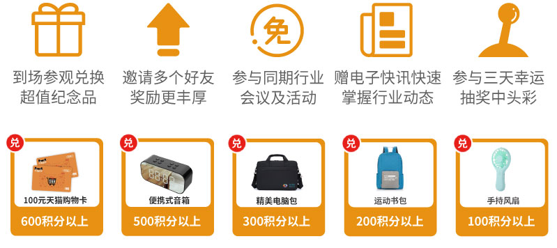 第十屆上海國際泵閥展預(yù)登記通道現(xiàn)已正式開啟,現(xiàn)在報(bào)名預(yù)登記即享多重觀展禮遇,提名人/組團(tuán)發(fā)起人按實(shí)際預(yù)登記人數(shù)獲得相應(yīng)的積分獎(jiǎng)勵(lì),積分可在展會(huì)現(xiàn)場(chǎng)兌換天貓購物卡、便攜式音響、運(yùn)動(dòng)書包等精美禮品。
