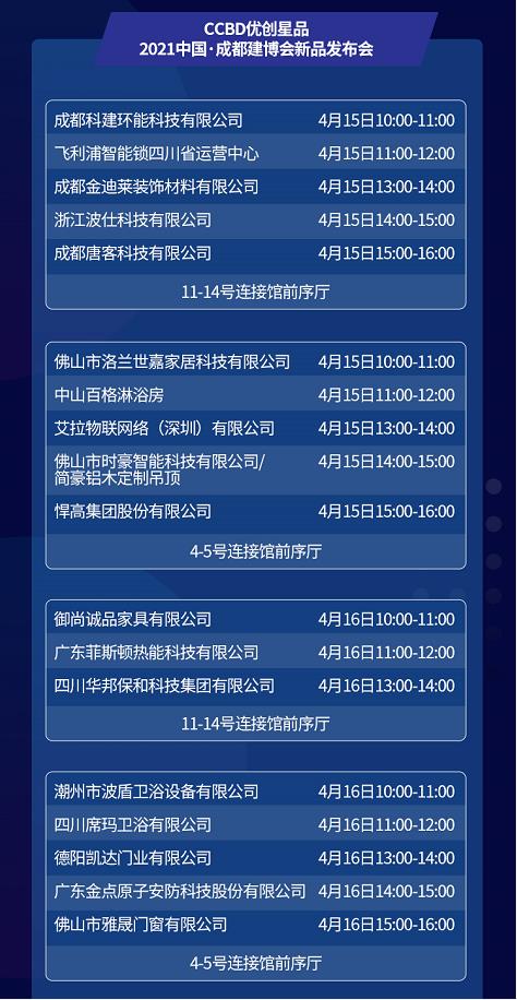 成都建博會作為中西部最大行業(yè)展會,對于很多經(jīng)銷商和渠道商而言,這里不僅是一次商貿(mào)對接會,更是一場行業(yè)新品發(fā)布會,行業(yè)品牌都會選擇展會平臺,發(fā)布新品爆款。展會組委會將聯(lián)合18家參展品牌企業(yè)舉辦“CCBD優(yōu)創(chuàng)星品——2021中國成都建博會新品發(fā)布會”,為市場和用戶揭曉大家居建裝市場所涌現(xiàn)出的一系列新產(chǎn)品、新方案、新技術(shù),助力展商和觀眾之間實現(xiàn)合作。