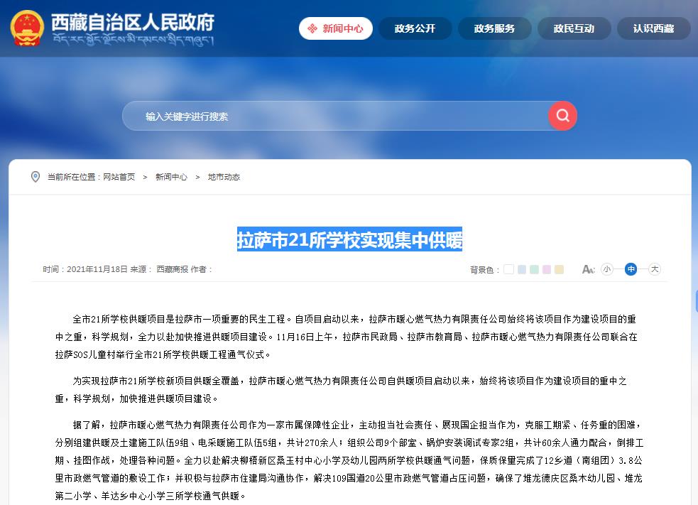 11月16日上午,西藏拉薩市民政局、拉薩市教育局、拉薩市暖心燃?xì)鉄崃τ邢挢?zé)任公司聯(lián)合在拉薩SOS兒童村舉行全市21所學(xué)校供暖工程通氣儀式。截至目前,由拉薩市暖心燃?xì)鉄崃τ邢挢?zé)任公司承建的城關(guān)區(qū)11所學(xué)校、堆龍德慶區(qū)6所學(xué)校、柳梧新區(qū)3所學(xué)校和拉薩SOS兒童村,共計21所學(xué)校全部按期完成庭院燃?xì)夤艿?、供暖管道及戶?nèi)供暖設(shè)施設(shè)備的安裝,并已實現(xiàn)供暖點火。其中,16所學(xué)校為氣供暖,5所學(xué)校為電供暖,集中氣供暖時間與全市其他學(xué)校同步,從11月15日至次年3月15日。