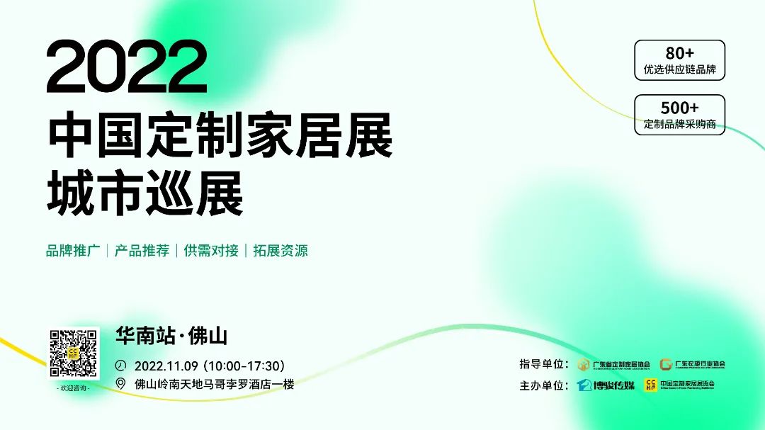 由廣東省定制家居協(xié)會、廣東衣柜行業(yè)協(xié)會指導(dǎo),中國廣州/成都定制家居展、博駿傳媒聯(lián)合全國各地商協(xié)會主辦的“2022中國定制家居展·城市巡展”,將于11月9日首次落地華南站在佛山·嶺南天地馬哥孛羅酒店舉行,本次巡展將以粵港澳大灣區(qū)為中心,輻射廣州、佛山、深圳、東莞、中山等中心城市。