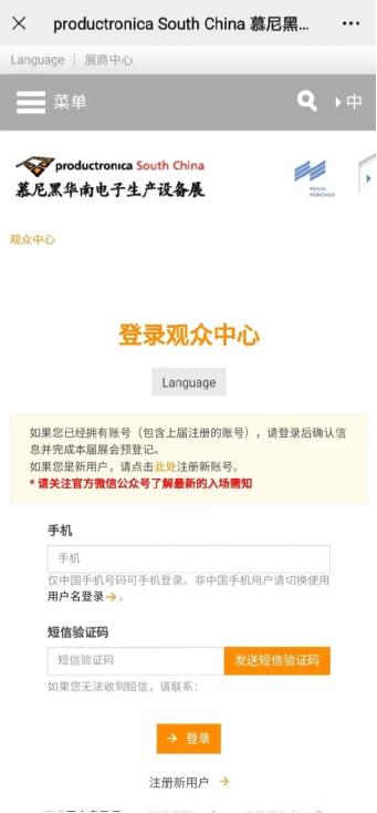 進(jìn)入預(yù)登記頁面后,往屆觀眾可直接填寫手機(jī)號(hào),獲取驗(yàn)證碼登錄,新用戶請(qǐng)點(diǎn)擊[注冊(cè)新用戶]按鈕注冊(cè)。