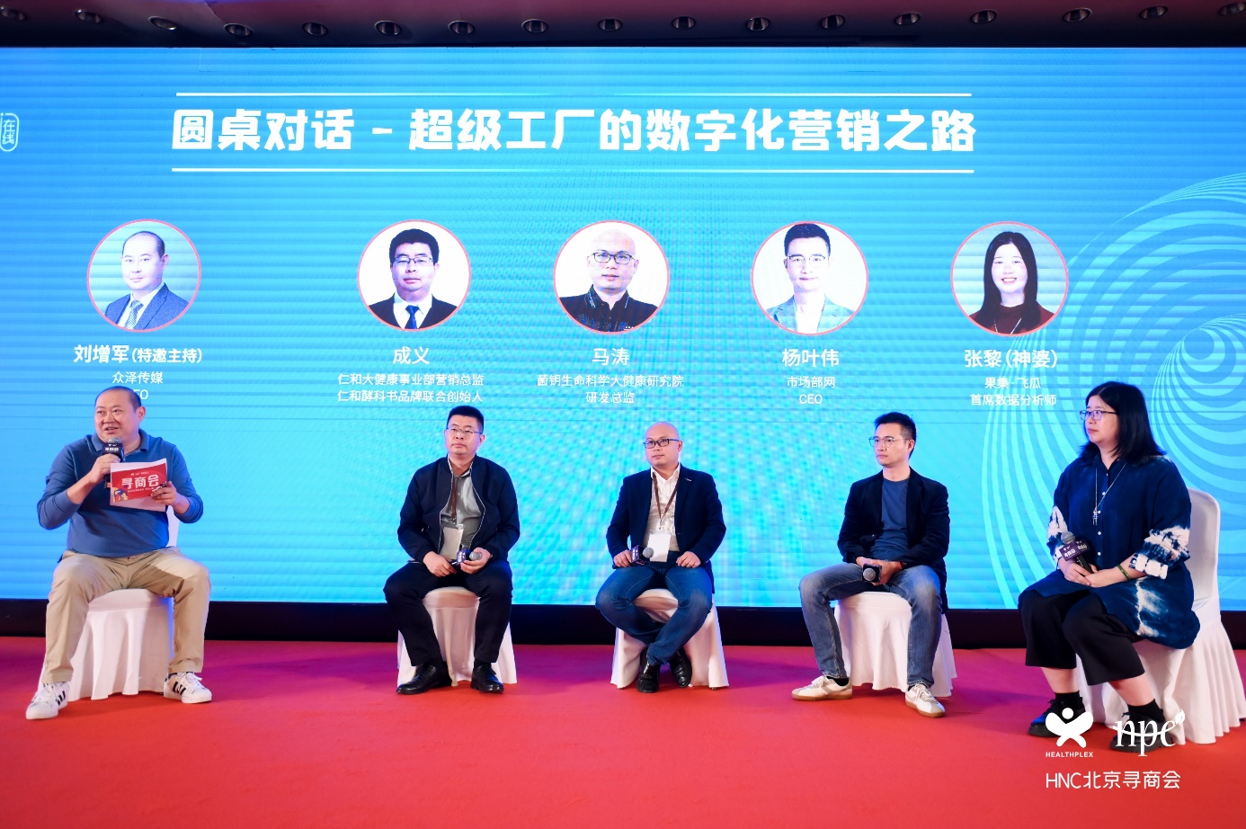 從左至右:眾澤傳媒CEO劉增軍(主持)、仁和大健康事業(yè)部營銷總監(jiān) 、仁和酵科書品牌聯(lián)合創(chuàng)始人成義、菌鑰生命科學大健康研究院研發(fā)總監(jiān)馬濤、市場部網(wǎng)CEO楊葉偉、果集•飛瓜首席數(shù)據(jù)分析師 神婆