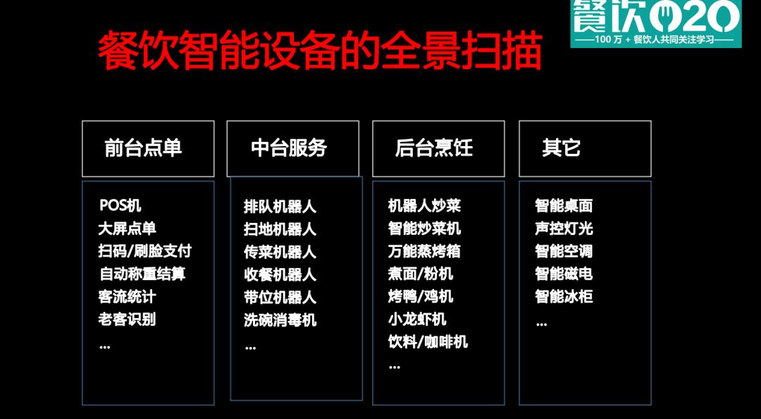 《2023年餐飲設(shè)備智能化發(fā)展報告》對餐飲業(yè)的智能設(shè)備進行了全景掃描,根據(jù)流程環(huán)節(jié)分為四大類:前臺點單、中臺服務(wù)、后臺烹飪、其它。餐飲如何做設(shè)備智能化?關(guān)鍵就是:前臺極致個性化,后臺極致效率化。