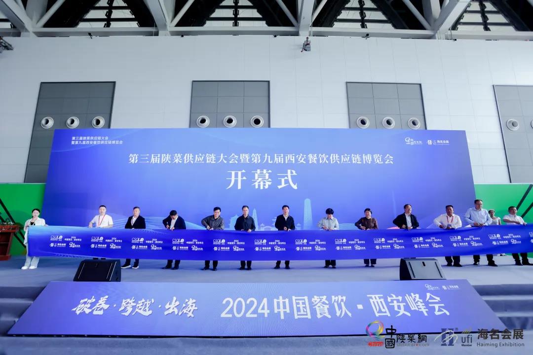 陜西省商務(wù)廳副廳長郭紹敏;陜西省三秦文化研究會(huì)會(huì)長張社年;西安市商務(wù)局一級(jí)調(diào)研員陸晴;陜西省三秦文化研究會(huì)副會(huì)長、陜西金控集團(tuán)原董事長權(quán)永生;陜西省三秦文化研究會(huì)副會(huì)長王宏;陜西省三秦文化研究會(huì)副會(huì)長、陜西旅游集團(tuán)總經(jīng)理任公正;重慶市小面協(xié)會(huì)會(huì)長張壽江;蘭州烹飪協(xié)會(huì)會(huì)長趙順謙;陜味食族油潑面創(chuàng)始人陳雷;深圳老碗會(huì)創(chuàng)始人楊富強(qiáng);陜西省餐飲聯(lián)合會(huì)駐會(huì)會(huì)長黨小兵;西安飯店與餐飲行業(yè)協(xié)會(huì)會(huì)長王小唐共同剪彩,第三屆陜菜供應(yīng)鏈大會(huì)暨海明·2024第9屆西安餐飲供應(yīng)鏈博覽會(huì)正式啟動(dòng)。
