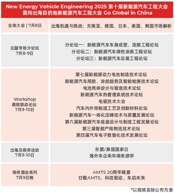 NEV Engineering 2025 第十屆新能源汽車工程大會(huì)全新出發(fā),打造:面向出海目的地的新能源汽車工程大會(huì),結(jié)合主辦方勵(lì)展全球化汽車產(chǎn)業(yè)合作資源,預(yù)計(jì)將吸引4,000名中國及1,000名來自東南亞、日本、韓國、德國、美國、印度及其他海外目的地車企、產(chǎn)業(yè)協(xié)會(huì)園區(qū)政府機(jī)構(gòu)等領(lǐng)域的行業(yè)精英,共同探討新能源汽車車身,綠色涂裝、總裝、三電工程及零部件制造工程領(lǐng)域的前沿技術(shù)、市場(chǎng)趨勢(shì)、以及出海目的地的政策法規(guī)及合作機(jī)遇,為行業(yè)精英提供一個(gè)不出國門即可深度參與的國際交流盛會(huì)。